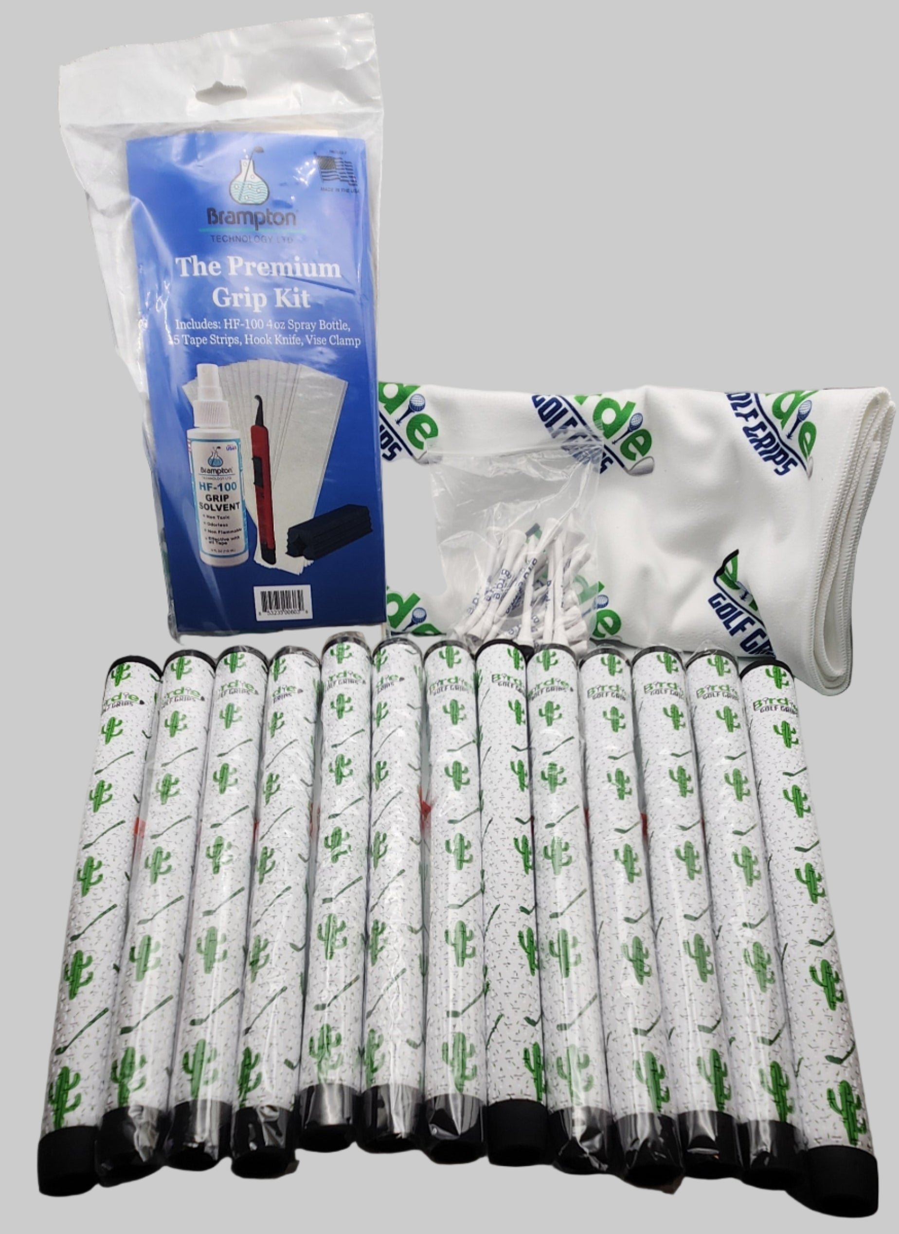Add a splash of southwest fun to your game with the Cactus Grip Starter Pack! This playful set includes 13 tacky grips, tees, and a Birdie Caddie Golf Towel. Plus, it comes with all the trusted tools you need from Brampton Technologies—hook blade, solvent, tape, and rubber clamp—to easily install your new grips and get back to swinging with confidence.