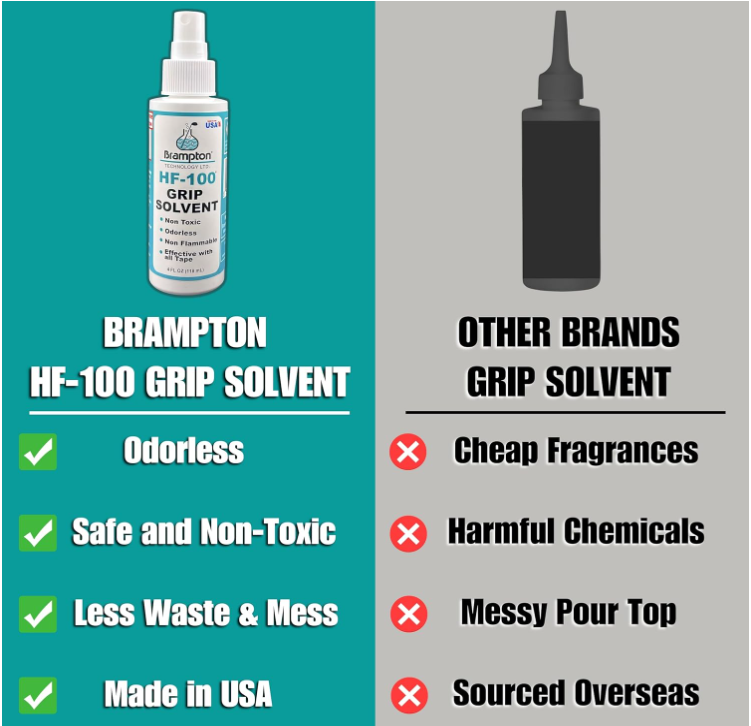 - HF-100 Golf Grip Solvent: HF-100 golf grip solvent is non-flammable, non-irritating, odorless, and effective on all golf grip tapes. Our golf grip changing kit is made in the USA by Brampton Technology.